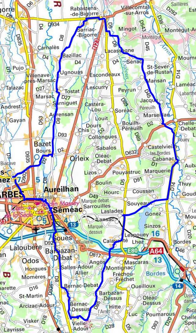 | Bordères, Soues,D8, Bernac-Debat, Bernac-Dessus, Montignac, Laslades, Cabanac, Marseillan, Mansan, Sénac, D6, Rabastens, Sarriac, Bazillac,Tostat, Bours, Bordères. |