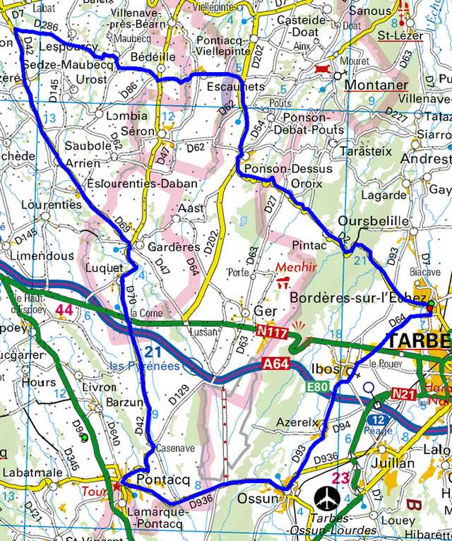 | Bordères, Pintac, Oroix, Ponson-Dessus, TaD D202, TaG D247, Escaunets, Bédeille, D286, TaD Sedze-Maubecq, TaG Lespourcy, Rte de Gabaston, TaD Sedzère, Arien , Eslourenties, Gardères, Luquet, D70, D42 Pontacq, Ossun, Azereix, Ibos, Bordères. |