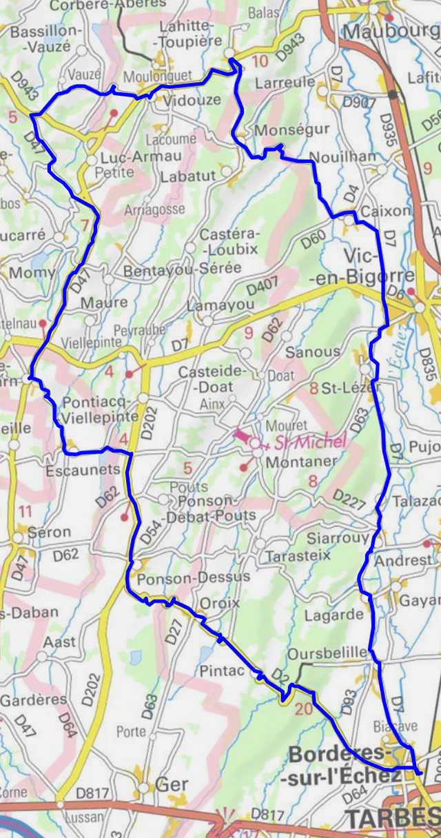 | Bordères, Bois du Commandeur, Pintac, Oroix, TaD crois. D204-202, Ponson-Dessus, TaG crois. D202-D200, Escaunets, TaD crois. D247-D347, Villenave-près-Béarn, D47, TaD Crois. D47-D943, TaG crois. D943-D148, puis D68-TaD Crois. -D68-D943, Vidouze, Lahitte-Toupière, TaD Crois. D943-D959, Caixon, Vic en Bigorre, St Lézer, Talazac, Siarrouy, Lagarde, Oursbelille, Bordères. |