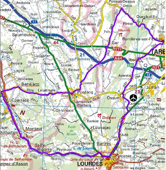 Bordères, Ibos, Azereix, Ossun, Prendre D16, TaD crois. D16-RN21, Adé, Lourdes, St Pé de Bigorre, Lestelle-Bétharram, Nay, TaD crois. D937-D936, Bénéjacq, Labatmale, Pontacq, Ger, Oroix, Pintac, Bordères. |