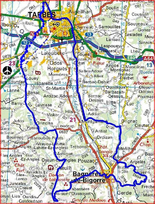 Bordères, Soues, Montgaillard, TaG, Orignac, Haut de la côte Bagnères, Dir, Uzer, TaD, Lies, Col des Palomières, Bagnères, Labassère, Soulagnets, Dir Neuilh, Astugue, Loucrup, TaG, Orincles, Bénac, Juillan, Rond-Point de Bastillac, Urac, Bordères. |