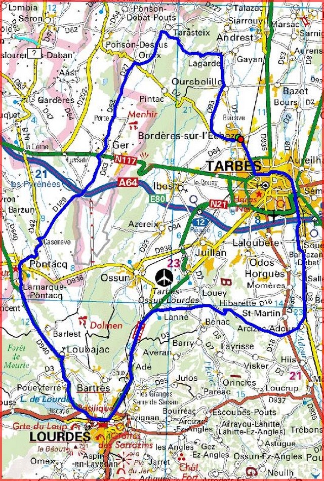 Bordères ,Soues, Bernac-Debat ,Arcizac-Adour, Bastourra, Hibarette, Lanne ,prendre la RN 21,Lourdes, Loubajac, Pontacq, Ger, Oroix, Tarasteix, Lagarde, Oursbelille, Bois du Commandeur, Bordères. |