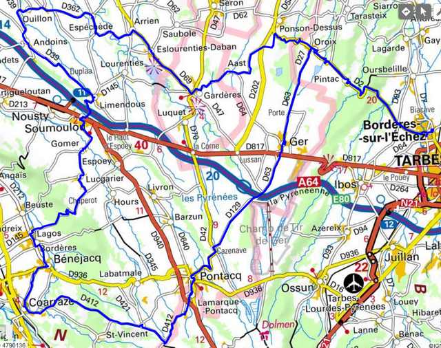 | Bordères, Pintac, Oroix, Aast, Gardères, Eslourenties, Arrien, TaG, Espéchède, Ouillon, TaG, Andoins, Limendous, Soumoulou, Gomer, Lucgarier, D145, Lagos, Bordères, Bénéjacq, Coarraze, D412, Saint Vincent, TaG, Lamarque-Pontacq, Pontacq, Ger, Oroix, Bordères |