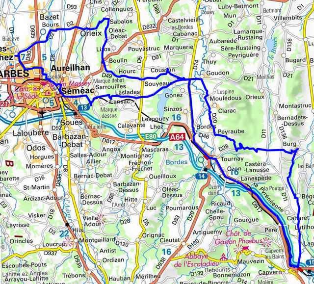 | Bordères, Bours, Orleix, Sabalos, Oléac-Debat, Boulin, Souyeaux, Coussan, TaD, D14, Bordes, Tournay, Ozon, D817, Capvern, D11, TaG, D11, Lutilhous, Bégole, Burg, TaG, D28 puis D46, Peyraube, TaD, D20, Moulédous, Goudon, TaG, D21, Laslades, Sarrouilles, Séméac, Bordères. |