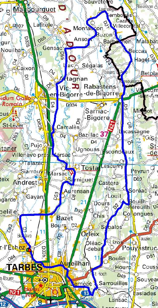 | Bordères, Aureilhan, Séméac, TaG crois. D21-D199, Sarrouilles, TaD crois. D119-D632, TaG crois. D632-D119, Boulin, Oléac-Debat, Sabalos, Louit, TaG D5, Soréac, Rabastens, TaD D124, Haget, Beccas, Buzon, TaG crois.D31-D505, Monfaucon, TaG crois. D505-D5, TaG crois. D5-D52, TaD crois.D5-D52-D708, Ansost, TaD crois.D8-D55,Gensac, Artagnan, Camalès, Villenave près Marsan, Marsac, prendre D8, Sarniguet, Aurensan, Bazet, Oursbelille, Bordères |