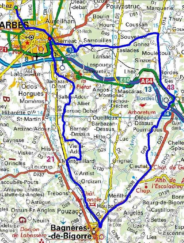 | Bordères, Bout du Pont, Séméac, Laslades, Bas de Goudon, TaD crois. D21-D14, Bordes, Tournay, D28 puis D83,Poumarous, Cieutat, Bagnères, D8,Ordizan, Biscuiterie Védère, TaD crois. D8-D28, puis TaG Crois. D28-D85, TaG crois. D85-D3,Vielle-Adour, Bernac-Dessus,Bernac-Debat,Allier, Barbazan-Debat, Soues, Bout du Pont, Bordères. |