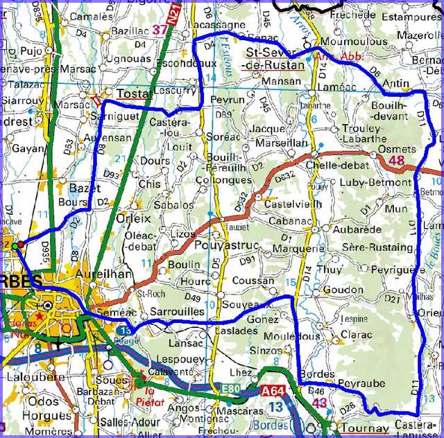 | Bordères, Bout du Pont, Séméac, Laslades, Bas de Goudon, Bordes, Peyraube, TaG croisement D46-D28, TaG croisement D28-D11, Sère-Rustaing, Lamarque-Rustaing, Luby-Betmont, Lubret-St-Luc, Antin, St Sever de Rustan, Sénac, Bas de Lacassagne, Bas de Lescurry, Castéra-Lou, Tostat, Bours, Bordères. |