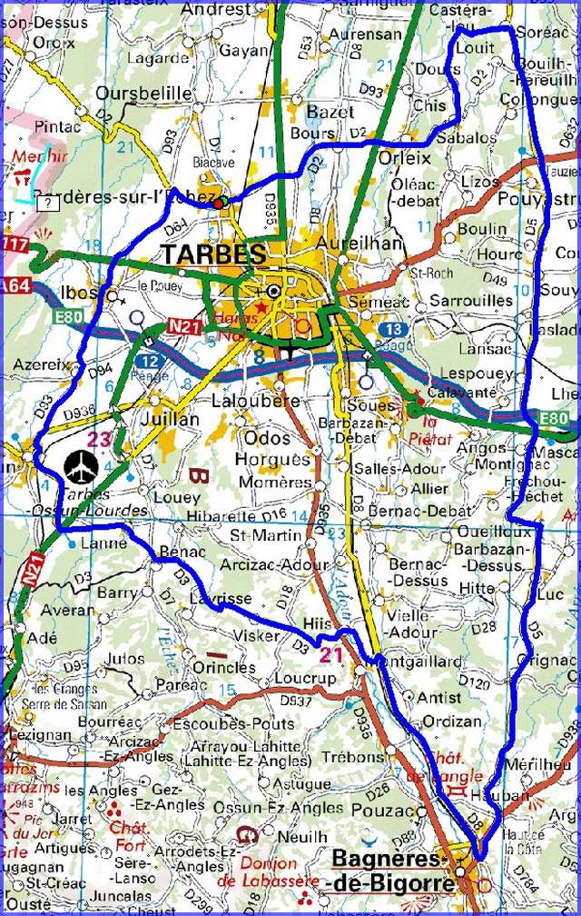 Bordères, Bois du Commandeur, Ibos, Azereix, Ossun, prendre D16, Lanne, Bénac, Visker, Hiis, Montgaillard, Ordizan, Bagnères, Haut de la Côte, Hauban, Orignac, Luc, Oueilloux, Mascaras, Souyeaux, Pouyastruc, Soréac, Dours, Sabalos, Orleix, Bours, Bordères. |
