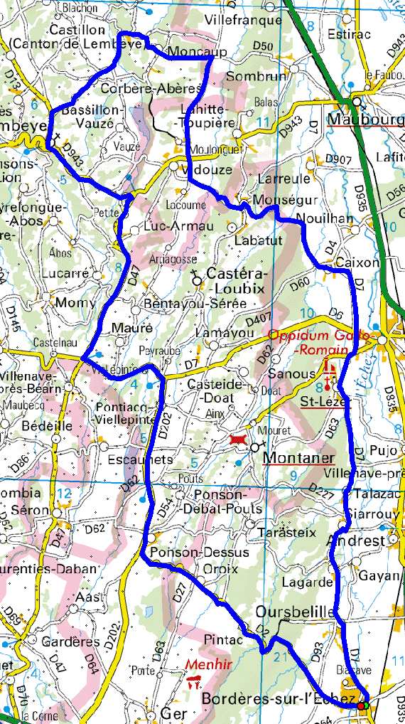 Bordères, Saint Lézer ,Caixon ,Monségur ,Vidouze,TaG crois. D48-D221, Moncaup, TaG D221-D142,Corbère-Abères,Lembeye , prendre D943, TaD crois. D943-D47,TaD crois. D47-D7,Viellepinte, TaD crois. D7-D202, Pontiacq-Viellepinte, Ponson-Dessus, TaG crois. D202-D204,Oroix , Pintac,Bordères. |