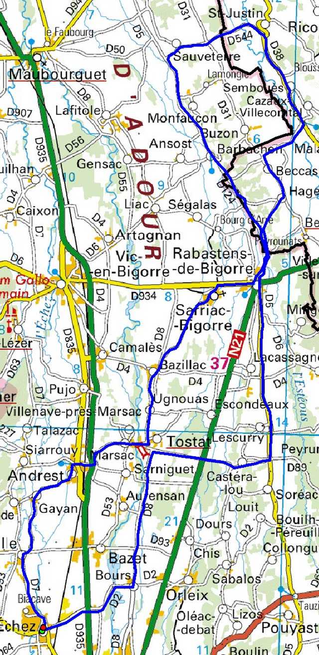 | Bordères,Oursbelille,Gayan,Andrest,Marsac,Tostat,Bazillac,Sarriac,Rabastens,Sauveterre, bas de Saint-Justin,Sembouès,bas de Cazaux-Villecomtal,Haget,Rabastens,Castéra-Lou,Tostat,Bours,Bordères |