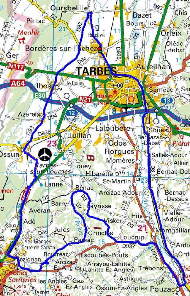 | Bordères, Oursbelille, Bois du Commandeur, Ibos, Azereix, Ossun, prendre D16, Adé, Lourdes,prendre D937, TaG vers Lézignan, Bourréac, Paréac,Barry,Orincles, Bénac, TaD croisement D3-D203, Layrisse, Loucrup , TaG , D937,Trébons, Pouzac, Ordizan, Soues, Bout du pont, Bordères. |