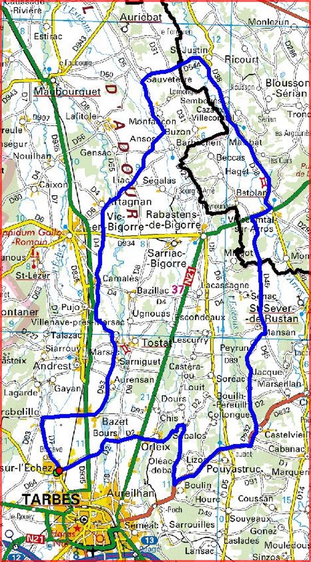 Bordères, Oursbelille, Bazet, Marsac, Camalès, Artagnan, Liac, Ansost, Sauveterre, TaD, Saint-Justin, Villecomtal sur Arros, TaD puis TaG, D 543, bas de Sénac, Mansan, Peyrun, Bouilh-Péreuilh, Castelvieilh, Boulin, TaD, Oléac-Debat, Sabalos, Orleix, Bours, Bordères. |
