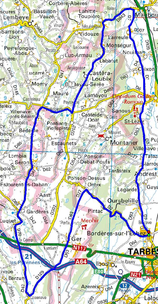Bordères, Bois du Commandeur, Pintac, Oroix, Ger, rond point D63, puis D129,Haut de Pontacq, TaD crois. D129, D D42, Luquet, Gardères, Séron, Bédeille, Villenave prés Béarn, TaD crois D47-D7, Villepinte, TaG crois. D7- D202, Castéra-Loubix, Monségur, Lahitte-Toupière, TaD crois. D59-D493, TaD crois. D943-D7, Larreule, St- Lézer,Oursbelille, Bordères. |