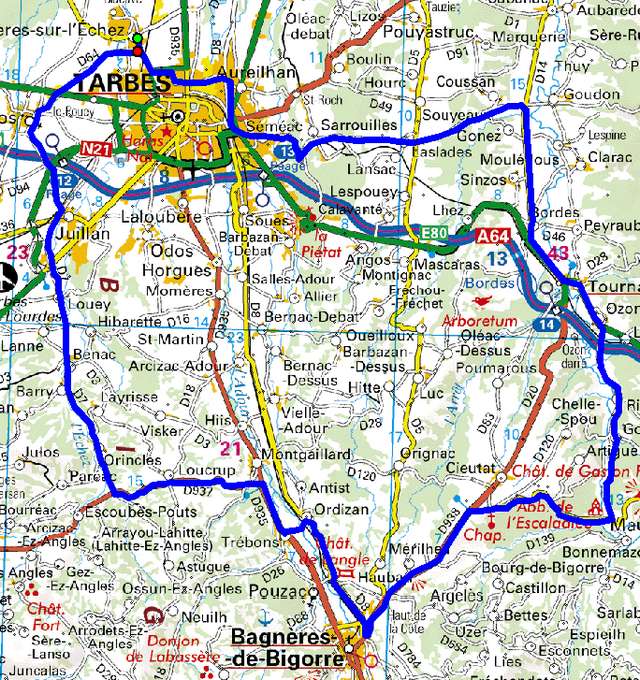 Bordères, Séméac, Bas de Goudon, TaD, Bordes, Tournay, Ozon, TaD, Gourgue, L’Escaladieu, Bagnères, Loucrup, Bénac, Juillan, Crématorium, Ibos , Bordères |