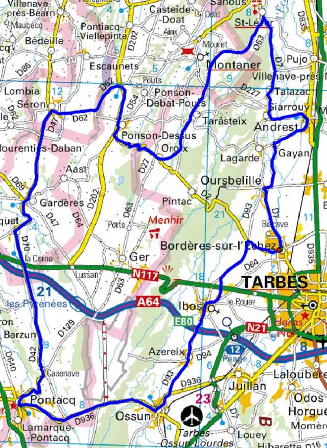 | Bordères, Bois du Commandeur,Ibos, Azereix, Ossun,Pontacq, Haut de Pontacq, Luquet, Gardères, Séron, D62, TaD Croisement D62-D202,Ponson-Dessus, Oroix, Tarasteix, St-Lézer, Talazac, Siarrouy,Andrest, Gayan, Oursbelille, Bordères. |