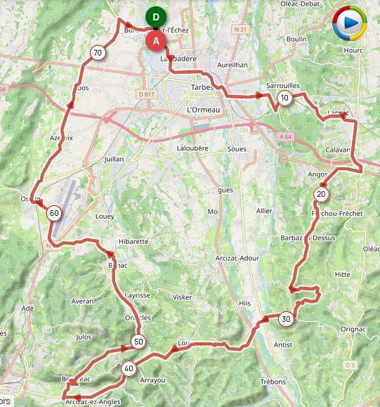 | Bordères, Séméac, Lansac, Lespouey, Angos, Montignac, Barbazan-Dessus, Rte de Hitte, D28, Montgaillard, Loucrup, Escoubès-Pouts, Lézignan, Bourréac, Orincles, Bénac, Lanne, Ossun, Azereix, Ibos, Bordères |