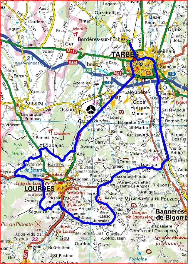 | Bordères ,Soues, Montgaillard, Loucrup, Escoubès-Pouts, Arcizac ez Angles, Juncalas, TaG, Les Angles, Col de Lingous, Juncalas, St-Créac, Le Pont Neuf, ,Aspin en Lavedan, Ossen, Ségus,Lourdes,TaG, D937,Peyrouse, TaD, Loubajac ,Bartrès ,Adé, Tarbes, Bordères. |