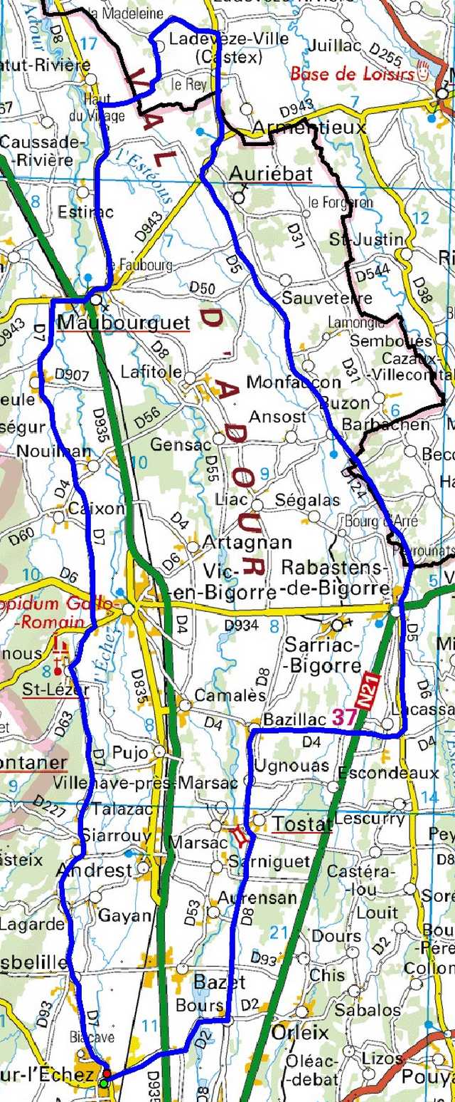 | Bordères, Oursbelille, Lagarde, Siarrouy, Talazac, St-Lézer, Vic en Bigorre, Larreule, Maubourguet, TaG crois. D943-D8, TaD crois. D8-Route du Manoir, Le Pécos, D562, Ladevèze-Ville, TaD à la Croix (Ligne de Crête), passer sous le Porche de La Madeleine, TaD crois. D225-D14, D14 puis D5, TaD crois D5-D943, TaG crois. D943-D5, Bas d’Auriébat, Barbachen, Rabastens, TaD crois. D5-D4, Bazillac, TaG crois. D4-D8, Ugnouas, Bours, Bordères. |