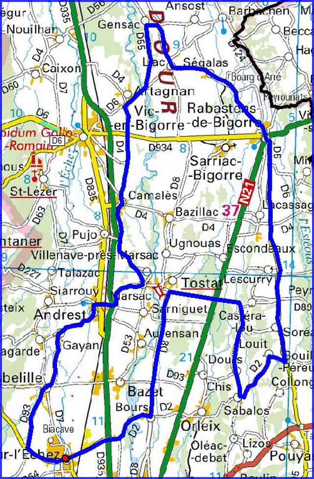 | Bordères, Bours,Tostat,Castéra-Lou,Dours, Sabalos,Louit,Soréac,Rabastens,Ségalas,Liac, Gensac,Artagnan,Camalès,Marsac,Andrest,Gayan,Oursbelille,Bois du Commandeur,Bordères. |