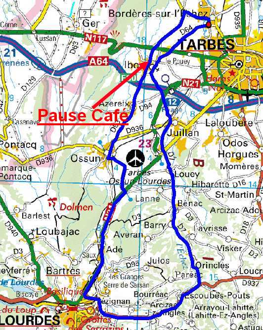 | Bordères, Ibos, Juillan, Louey, Bénac, Orincles, TaD D937, Lourdes, Adé, Ossun, Azereix, Ibos (Pause CAFÉ), bas du Bois du Commandeur, Bordères. |