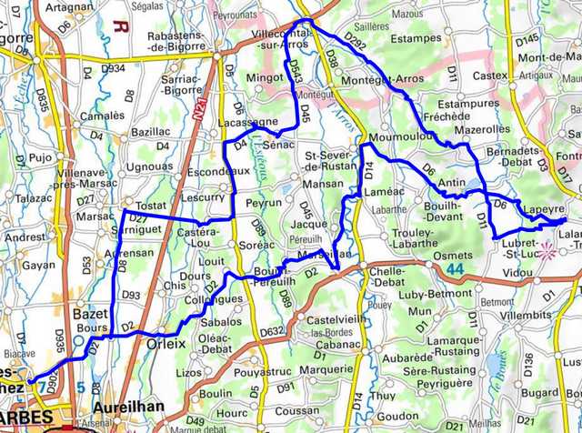 | ,Bordères, Bours, D8, Tostat, Castéra-Lou, D4, Sénac, D543, Villecomtal/Arros, Fréchède, Mazerolles, Lapeyre, Lubret-St-Luc, Antin, D6, St-Sever-de-Rustan, Laméac, Marseillan, Bouilh-Péreuilh, D2, Louit, Sabalos, Orleix, Bours, Bordères |