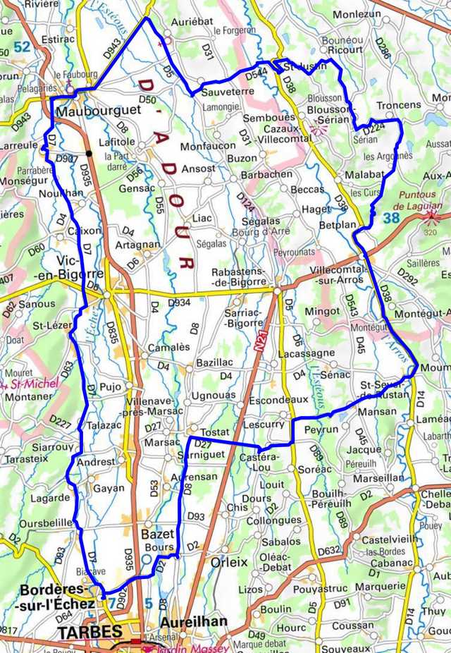 | Bordères, Oursbelille, Lagarde, Siarrouy, Talazac, St Lézer, Vic, Larreule, Maubourguet, D943, D5, Sauveterre, Saint-Justin, Blousson-Sérian, D224, ronces, D286, Betplan, D38, Villecomtal/Arros, D14, St-Sever de Rustan, D27, Mansan, D27, Castéra-Lou, D119, D27, D8, Bours,Bordères |