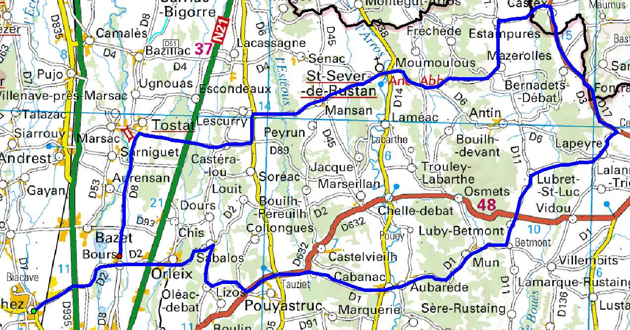 | Bordères, Bours, Orleix, Sabalos,Oléac-Debat, D1, Cabanac, Aubarède, D1, TaD vers Luby-Betmont, Lubret-St-Luc, TaD Chemin du Moulin, D611, Lapeyre, Rte du lavoir, TaD D17, D3, TaG Castex, Estampures, TaG Vers Mazerolles, Chemin de St Sever vers D6, St Sever de Rustan, D27, Mansan, D27, TaD D5, TaG D119, Castéra-Lou, D27, T0stat, D8, Bours , Bordères |