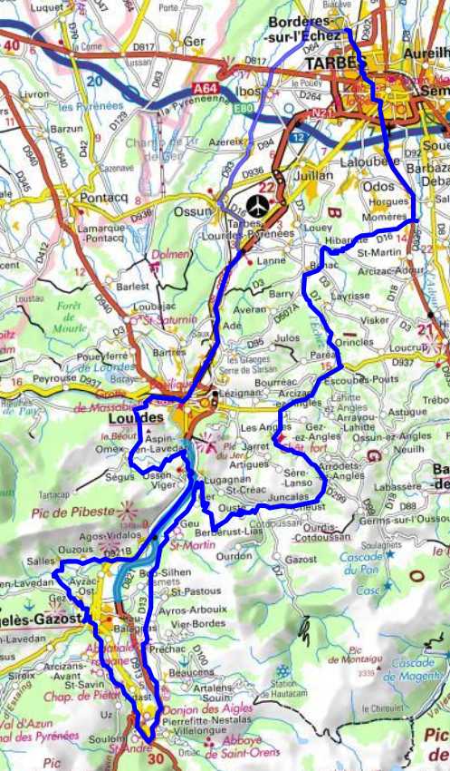 | Bordères, Ibos, Azereix, Ossun, Lourdes, D937, Omex, Ségus, Ossen, Aspin -en Lavedan, Agos-Vidalos, Ayzac-Ost, D102, Ouzous, Salles, Sére-en-Lavedan, Gez, Argelès-Gazost, Saint-Savin, D13, Pierrefitte, D913, D13, Beaucens, Préchac, Arros, D13, Lugagnan, TaD, D173, Berbérust, Oustè, Arcizac-ez-Angles, D937, Orincles, Bénac, Hibarette, Momères, Laloubère, Bordères |