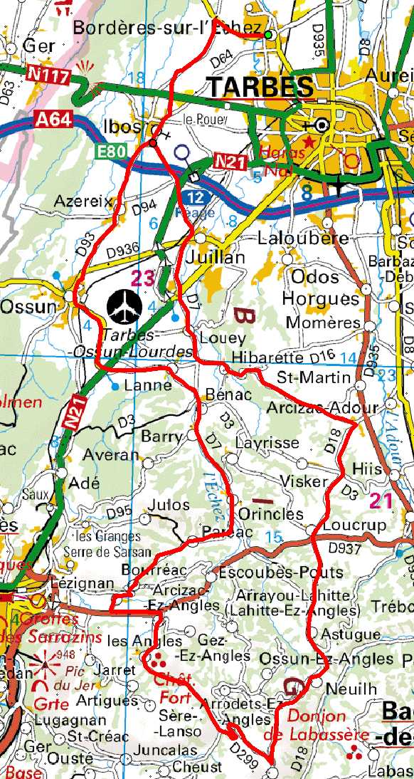 | Bordères, Bois du Commandeur, TaG D93, Rond-Point Debard, Ibos, Ossun, D16, au deuxième Rond-Point sous Route de Lourdes Dir. Lanne, D607, TaD crois. D607-D7, Bénac, Barry, Orincles, TaD sur D7, Paréac, Bourréac, Lézignan, TaG crois. D7-D937, Arcizac-ez-Angles, TaD crois D937-D7, Les Angles, Col de Lingous, TaD crois. D26-D299, Germs sur l’Oussouet, TaG crois. D299-D99, Col de la Croix Blanche, Neuilh, Ravitaillement, D18, Astugue, Loucrup, Attention à la traversée de la D937, rester sur D18, TaG sur D18 avant Arcizac-Adour, Bastourra, Hibarette, Louey, D7, Juillan, Crématorium, Ibos, Bordères |