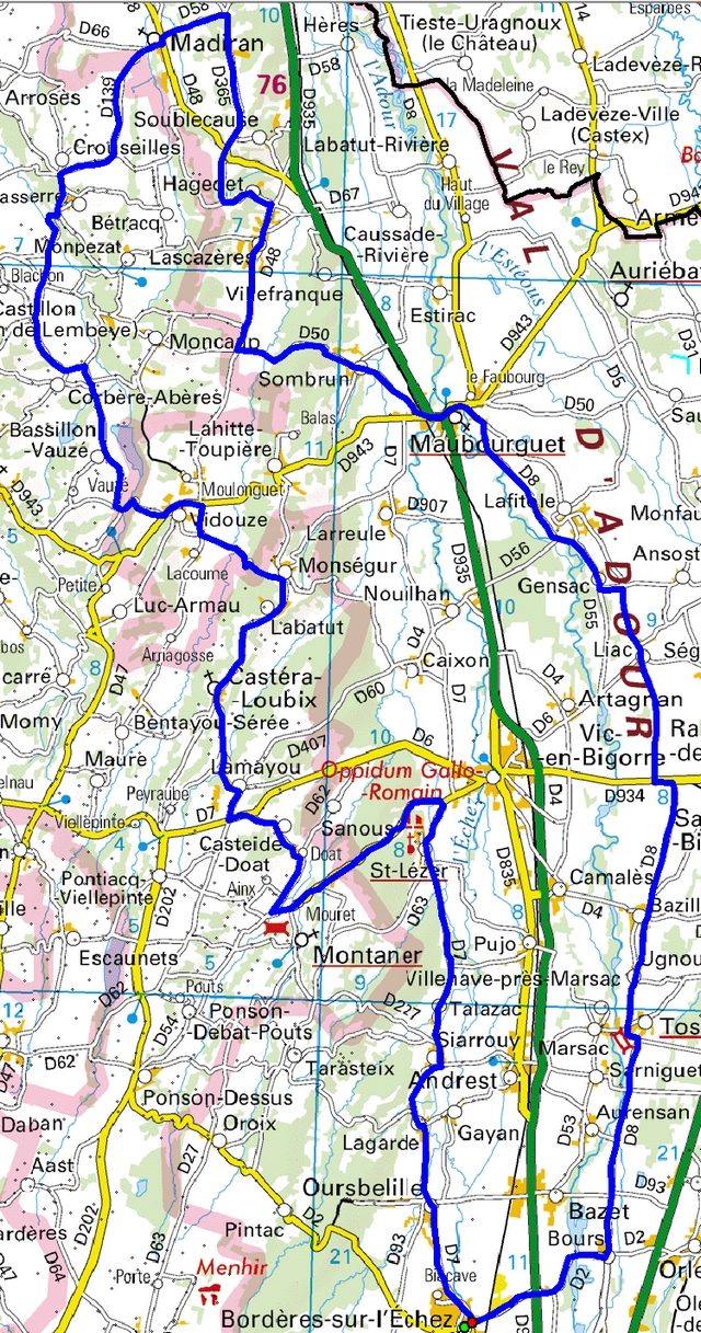 | Bordères, Oursbelille, St-Lézer, TaG D61, Montaner, TaD D61, Casteide-Doat, TaG (centre village) TaG D7, Lamayou, TaG (bourg) Castéra-Loubix, Labatut, Monségur, Vidouze, TaG D943, TaD D68, TaD D205, Bassillon-Vauzé, TaG ED142, Corbère-Abères, TaD D205, TaD D139, Lasserre, Crouseilles, TaD D58, Madiran, TaG D48, TaD D58, TaD D365, Soublecause, Tout Droit D748, Hagedet, TaD D48, Lascazères, TaG D50, Sombrun, Maubourguet, Lafitole, Gensac, Liac, Bazillac, Bours, Bordères. |