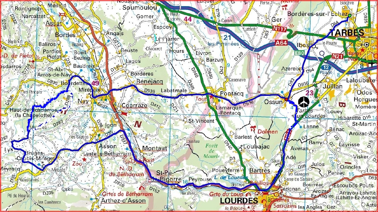 | Bordères, Ibos, Azereix, Ossun, Pontacq, Bénéjacq, Nay, Arros-de-Nay, TaG D288, puis D388, Haut-de-Bosdarros, TaD D287, TaG D388, Lys, Mifaget, Bruges-Capbis-Mifaget, Asson, TaD D937, Lestelle-Bétharram, St-Pé-de-Bigorre, Lourdes, Adé, Ossun, Azereix, Ibos, Bordères |