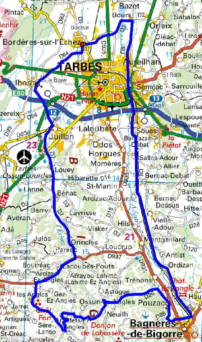 Bordères, Bours, Aureilhan, Soues, Salles-Adour, Bernac-Debat, Ordizan, Bagnères de Bigorre, TaD prendre D88, Pouzac, Neuilh, TaD crois. D26-D7, Col de Lingous, Les Angles, TaD crois. D7-D937, Arcizac-ez-Angles , Escoubès-Pouts,TaG crois. D937-D7, Orincles, Bénac, Louey, Juillan, Ibos, Bordères. |