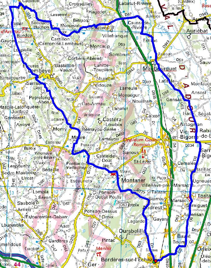 | Bordères, Oursbelille, Lagarde, Siarrouy, Montaner, Pontiacq-Villepinte, Bentayou-Séré, Lucarré, Peyrelongue-Abos, Bas de Lembeye, St-Jean-Poudge, Cadillon, D298, Monpezat, Lascazères, Caussade-Rivière, Estirac, Maubourguet, Lafitole, Gensac, Liac, Bazillac, Tostat, Bours, Bordères |
