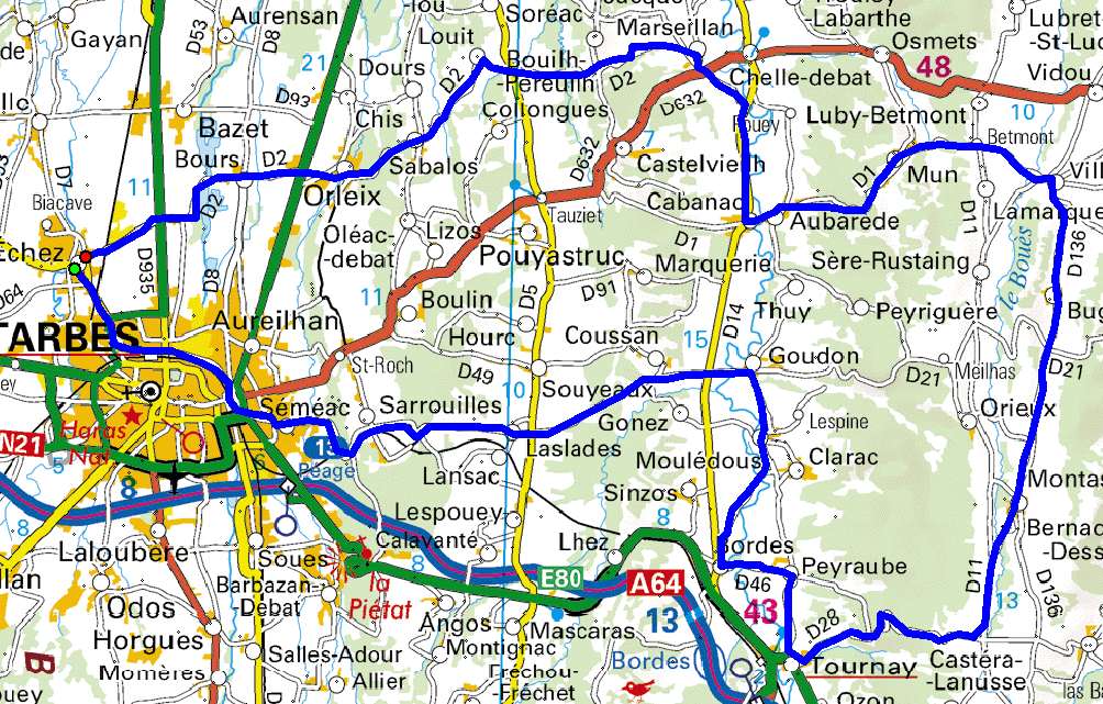 | Bordères, Bout du Pont, Séméac, Laslades, Goudon, Moulédous, Bordes, Peyraube, Tournay, Bernadets-Dessus, Bugard, Villembits, D1, Mun, Cabanac, Marseillan, Louit, Sabalos, Orleix, Bours,Bordères |