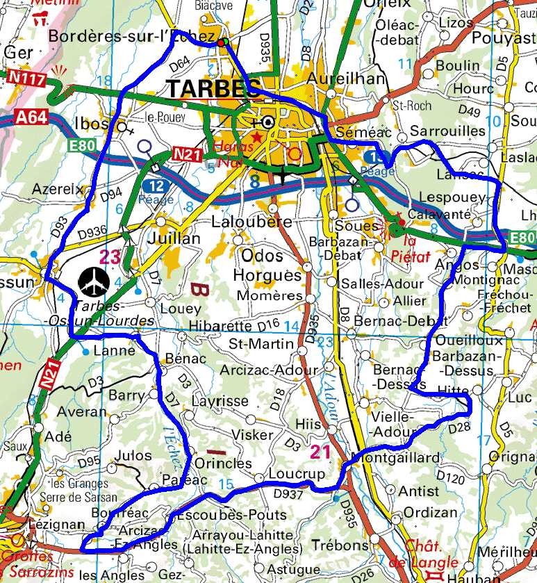 | Bordères, Séméac, Lansac, Lespouey, Angos, Montignac, Barbazan-Dessus, Rte de Hitte, D28, Montgaillard, Loucrup, Escoubès-Pouts, Lézignan, Bourréac, Orincles, Bénac, Lanne, Ossun, Azereix, Ibos, Bordères |