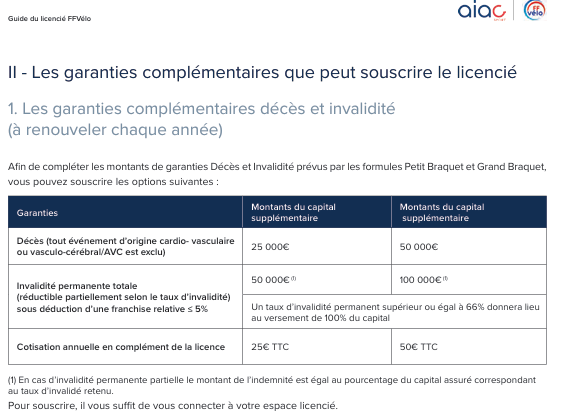 - La licence F F Vélo proprement dite avec une assurance en responsabilité civile minima - Possibilité de souscrire sur demande une assurance complémentaire, détails des garanties optionnelles proposées, en bas de page.