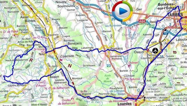 | Bordères , Ibos, Azereix, Ossun, Pontacq, Labatmale, D936, Bénéjacq, Nay, Bourdettes, Arros-de-Nay, D388, Haut de Bosdarros, D388, Bruges, D35, Asson, D35, Lestelle-Bétharram, D937, St-Pé, Peyrouse, D937, Lourdes, Adé, Juillan,Bordères |