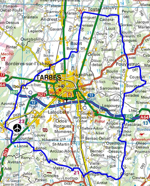 Bordères, Bours, Tostat, TaD D119, Castéra-Lou, D5, Pouyastruc, TaG D91 Marquerie, Coussan, TaD D21, Laslades, TaG vers Mascaras, Oueilloux, Luc, D5, Orignac, Montgaillard, Visker, Bénac, Lanne, Ossun, Azereix, Ibos, Bordères |