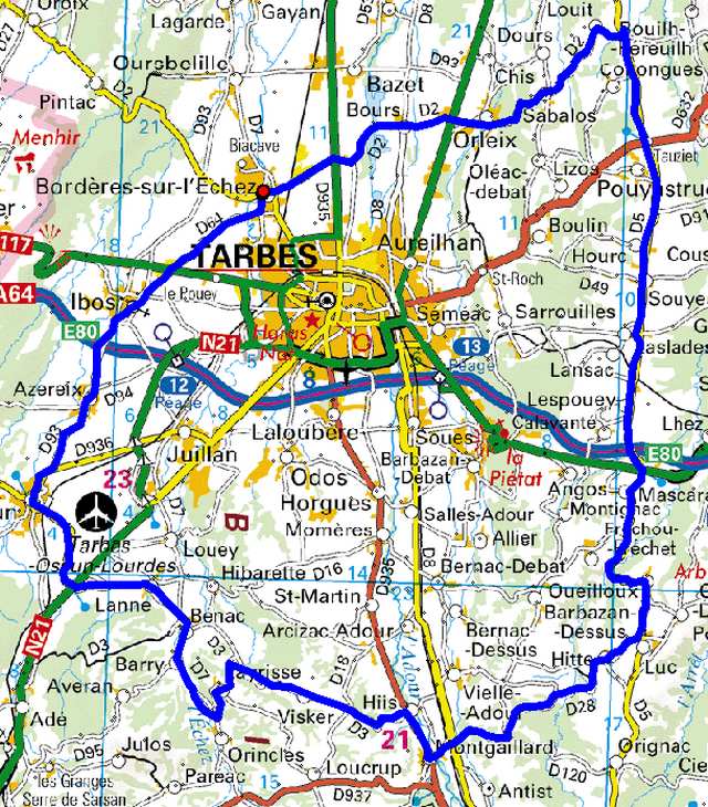 | Bordères, Bours, Orleix,Sabalos, Louit, Pouyastruc, Laslades, Mascaras, Oueilloux, Luc, Hitte, D28, Montgaillard, Hiis, Visker, D203, Layrisse, Orincles, D7, Bénac, Lanne, Ossun, Azereix, Ibos, Bordères. |
