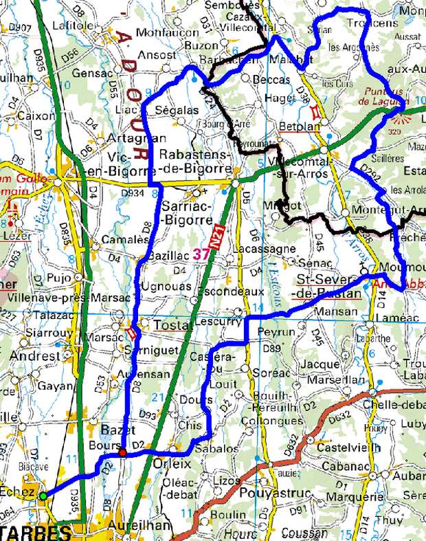 | Bordères, Bours, Orleix, Sabalos, D119, Dours, D119, D89, TaD D27, Mansan, D27, St Sever de Rustan, TaD vers Moumoulous, Moumoulous, Montégut/Arros, T à D Vallon des Fées, Vers D1021, D1021 TaG Chemin de Gendrau, D286, TaD 284, Malabat, TaG D280, Barbachen, D252, Liac, D8, Bazillac, Tostat, Bours,Bordères |