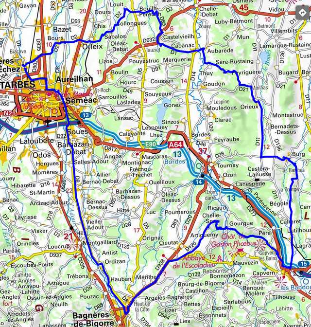 | Bordères, Bours, Orleix, Sabalos, D2, Louit, D2,Castelvieilh , D632, TaG, D1, Cabanac, Aubarède, D20, Peyriguère, Orieux, D11, TaG, Burg, Bégole, D11, Lutilhous, Capvern, D81E, D81, Gourgue, D120, Chelle-Spou, D120, D938, Bagnères de Bigorre, Ordizan, Soues, Bordères |