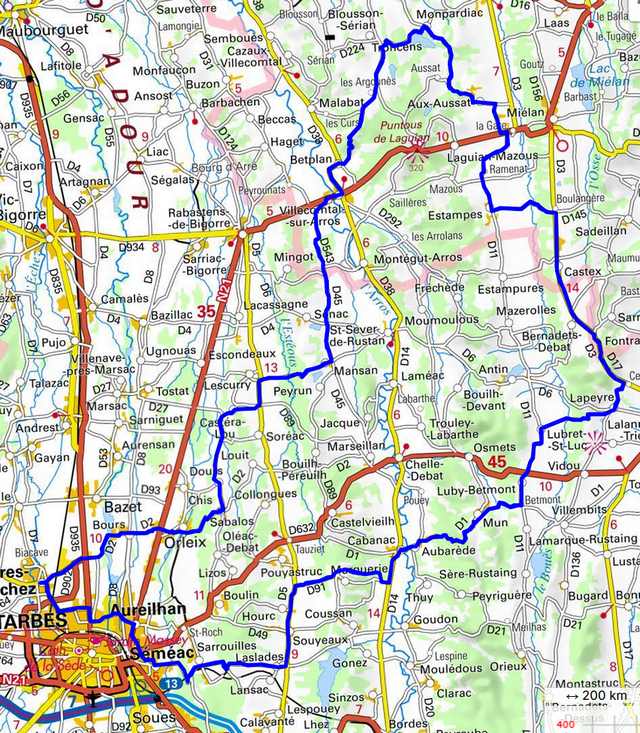 | Bordères, Bours, Orleix, Sabalos, Dours, Castéra-Lou, D5, TaD, D27, Mansan, D543, Villecomtal, TaG, D38, Betplan, D286, TaD, D564, Monpardiac, D555, TaD, D517, TaG, RN21 (prudence sur environ 200m), TaD, D146, Estampes, D3, TaG, Lapeyre, D611, Lubret-St-Luc, Luby-Betmont, TaD, D1, Mun, D1, Aubarède, Cabanac, TaG, Marquerie, D91, Souyeaux, Laslades, Séméac, Bordères |