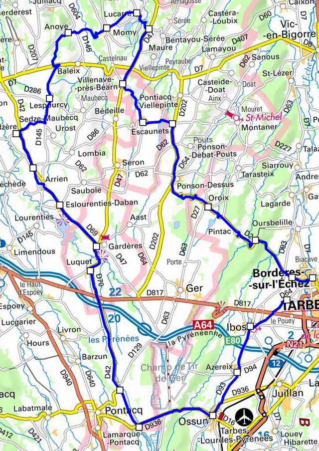 | Bordères, Ibos, Azereix, Ossun, D936, TaD, Haut-de-Pontacq, TaD, D42 puis D70, Luquet, Gardères, D69, Eslourentis-Daban, Arrien, Sedzère, Sedze-Maubecq, Lespourcy, Anoye, Momy, Lucarré, D47, Villenave près Béarn, Escaunets, TaG D247, TaD202, Ponson-Dessus, Oroix, Pintac, Bordères |