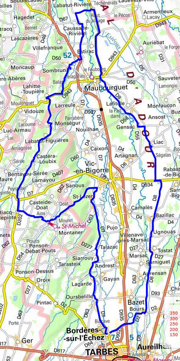 | Bordères,Oursbelille, Lagarde, Siarrouy, Talazac, St Lézer, Pontiacq-Viellepinte, Castéra-Loubix, Monségur, Lahitte-Toupière, Sombrun, Caussade-Rivière, Labatut-Rivière, D8, Maubourguet, D8, Lafitole, Gensac, Liac, Bazillac, Bours,Bordères, |