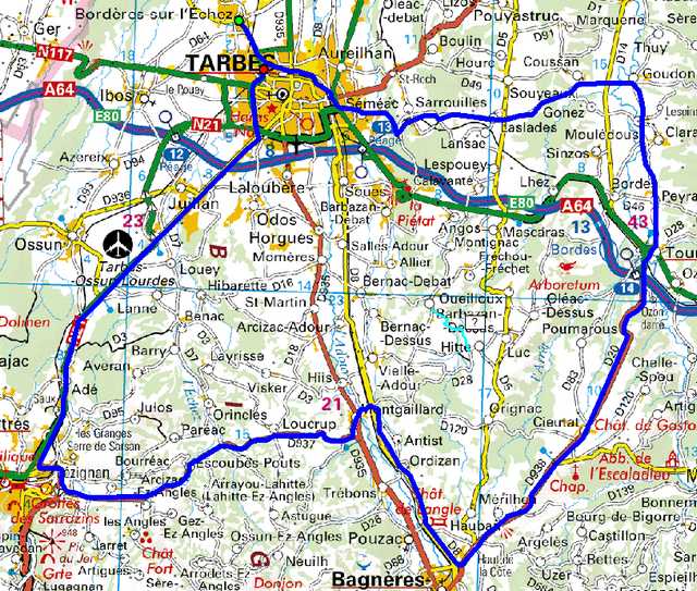 | Bordères, Tarbes, Adé, Lourdes, Arcizac-ez-Angles, Escoubès-Pouts, Loucrup, Montgaillard, Bagnères, TaG crois. D8-D938, Haut de la Côte, Cieutat, D20, Tournay, D20, Peyraube, Moulédous, TaG crois. D2-D21, Goudon, Laslades, Séméac, Tarbes, Bordères. |