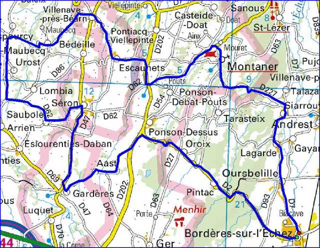 | Bordères. Bois du Commandeur. Pintac. Oroix. Ponson-Dessus. TaG D202. TaD D311. Aast. Gardères. TaD D47. Séron. TaG D62. Saubole. TaD D145. TaD D286. Sedze-Maubecq. TaG D386. TaG D47. Villenave-Prés-Béarn. TaD D347. Escaunets . Lac du Louet. TaD D202. TaG D62. Montaner. Siarrouy. TaD D7. Lagarde. Oursbelille. Bordères |