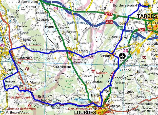 Bordères, Ibos, Azereix, Ossun, , Adé, TaD crois RN21-D3, Bartrès, Lourdes, Peyrouse, Saint-Pé de Bigorre, Lestelle-Bétharram, TaG, Croix des Hauteurs, TaD et prendre D-626, Asson, TaD croisement D626-D35, TaG croisement D35-D937, Igon, Coarraze, TaD Croisement D937-D936, Bénéjacq, Labatmale, Pontacq, Ossun, Azereix, Ibos, Bois du Commandeur, Bordères. |