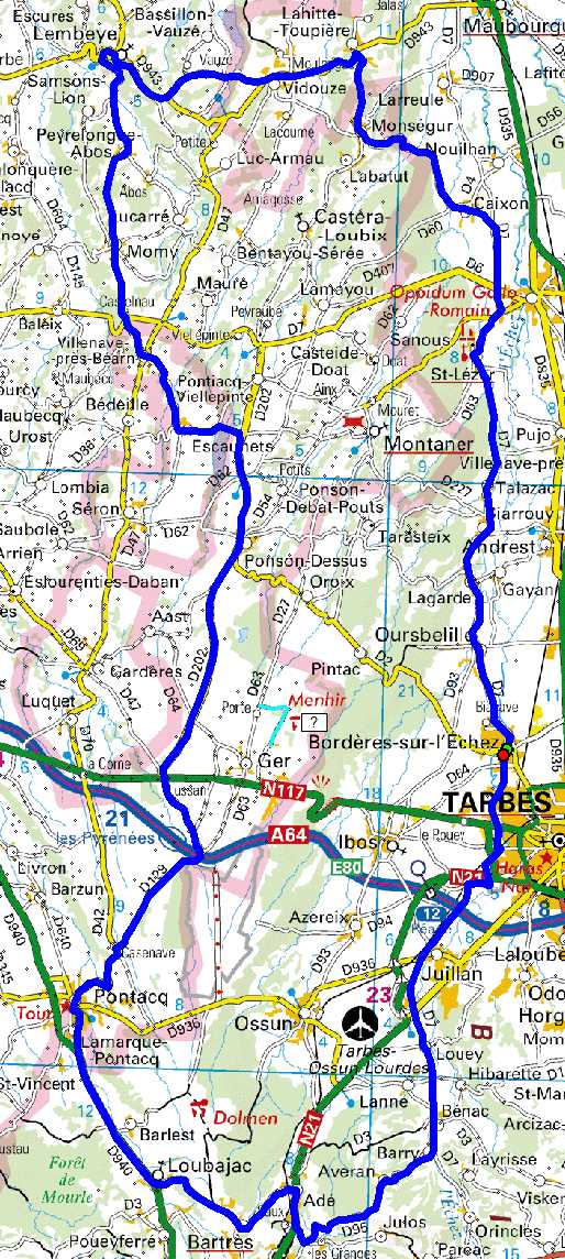 Bordères,Tarbes, Juillan,Louey, Bénac, Barry, Averan, Adé, Bartrès, Loubajac, Pontacq, D129, D202, Ponson-Dessus, Lac du Louet, Escaunets,Villenave près Béarn, Momy, Peyrelongue-Abos, Lembeye, Prendre direction Maubourguet, Lahitte-Toupière, TaD crois. D943-D59, Monségur, Caixon, Vic en Bigorre, St Lézer, Oursbelille, Bordères. |