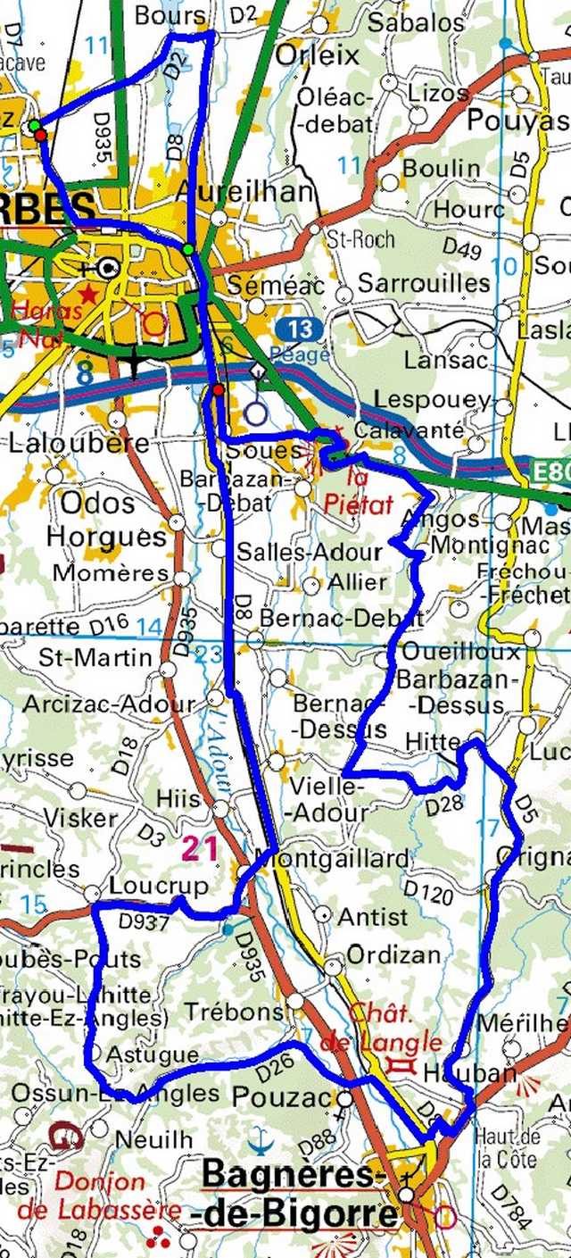 | Bordères, bout du pont, Soues, Piétat, Sarrouilles, Boulin, Pouyastruc (descendre la côte dans le village, Souyeaux,Laslades, bas de Goudon, Cabanac, TaG, croisement D632-D5, TaD, Soréac, Castéra-Lou, Tostat, Marsac, Sarniguet,Andrest, Siarrouy, Oursbelille, Bordères |