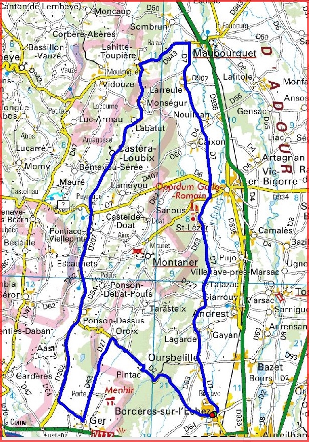 | Bordères,Bois du Commandeur, Pintac, Oroix, Ger, TaD Croisement D63-D64, TaD croisement D64-D202, Ponson-Dessus, Pontiacq-Viellepinte,Castéra-Loubix,Labatut,Lahitte-Toupière, Maubourguet, TaD croisement D943-D7, Larreule, Nouilhan, St Lézer, Talazac, Siarrouy, Lagarde, Oursbelille, Bordères. |